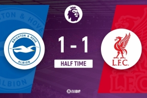 伤停补时5分钟。上半场比赛结束,布莱顿1-1利物浦。