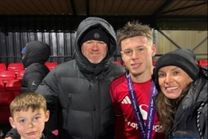 现年16岁的凯·鲁尼目前效力曼联U16队,他帮助球队在英超联赛盾杯决赛中2-0战胜伯恩利夺冠,鲁尼与妻子科琳现场观战。