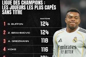 体育资讯04月16日讯 外媒《Onze Mondial》统计了未曾夺得欧冠冠军的球员中,这些球员的欧冠出场次数排行,姆巴佩98场排在历史第9位。布冯、伊布124场并列第一。