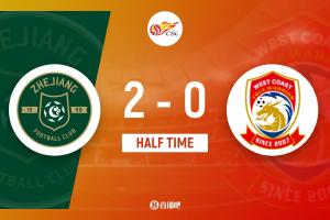 上半场补时3分钟。半场战罢,浙江队2-0青岛西海岸。